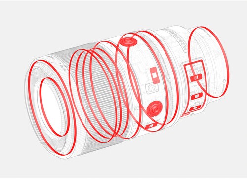 Buttons and switches sealed with silicone gaskets, a rubber ring that seals the lens mount, and other measures prevent the incursion of dust and moisture even in challenging outdoor conditions. The front element features a fluorine coating that repels contaminants and makes the lens easier to clean.