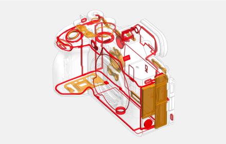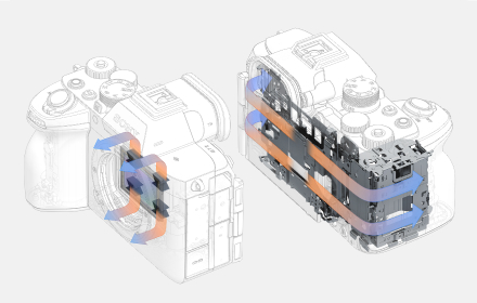Effective heat dissipation allows 4K 60p 4:2:0 8bit video to be recorded continuously for around 90 minutes. A unique Σ (sigma) shaped graphite component built into the image stabilisation unit allows the image sensor, a major source of heat inside the camera body, to move freely during image stabilisation while conducting heat away for efficient heat dissipation.